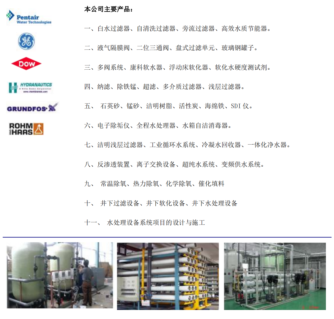 公司拥有一批经验丰富的水处理专业技术人员,精诚为厂矿、电厂、冶金、化工、电子、制药、食品饮料、锅炉等行业提供专业、专注的服务,先后与“攀钢集团、新疆天业股份、成都飞机制造厂、五粮液集团、一汽大众等上百家用户进行了成功的合作,主要从事工业循环水、生活饮用水、电子用水、化工用水、电厂用水、管道直饮水、锅炉软化水、食品饮料用水、中水回用、厂矿用水等。提供全面、及时、热情的技术支持及售后服务是我们洁明人的责任,愿我们真诚合作、共谋发展、共创民族品牌,推进中国水处理事业迈向国际******水平。